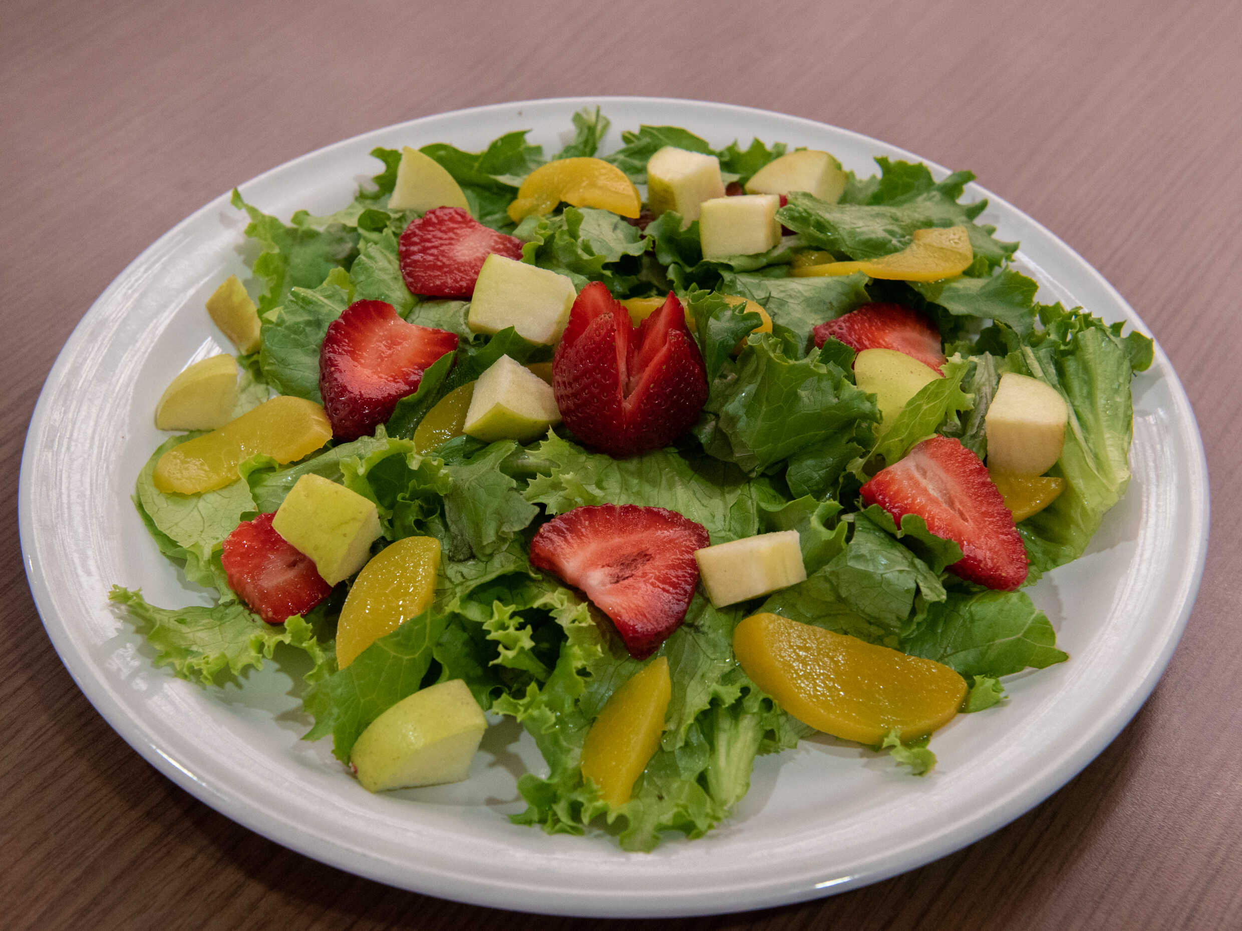 Lechuga, fresa, durazno, manzana verde, con aderezo de fresa.