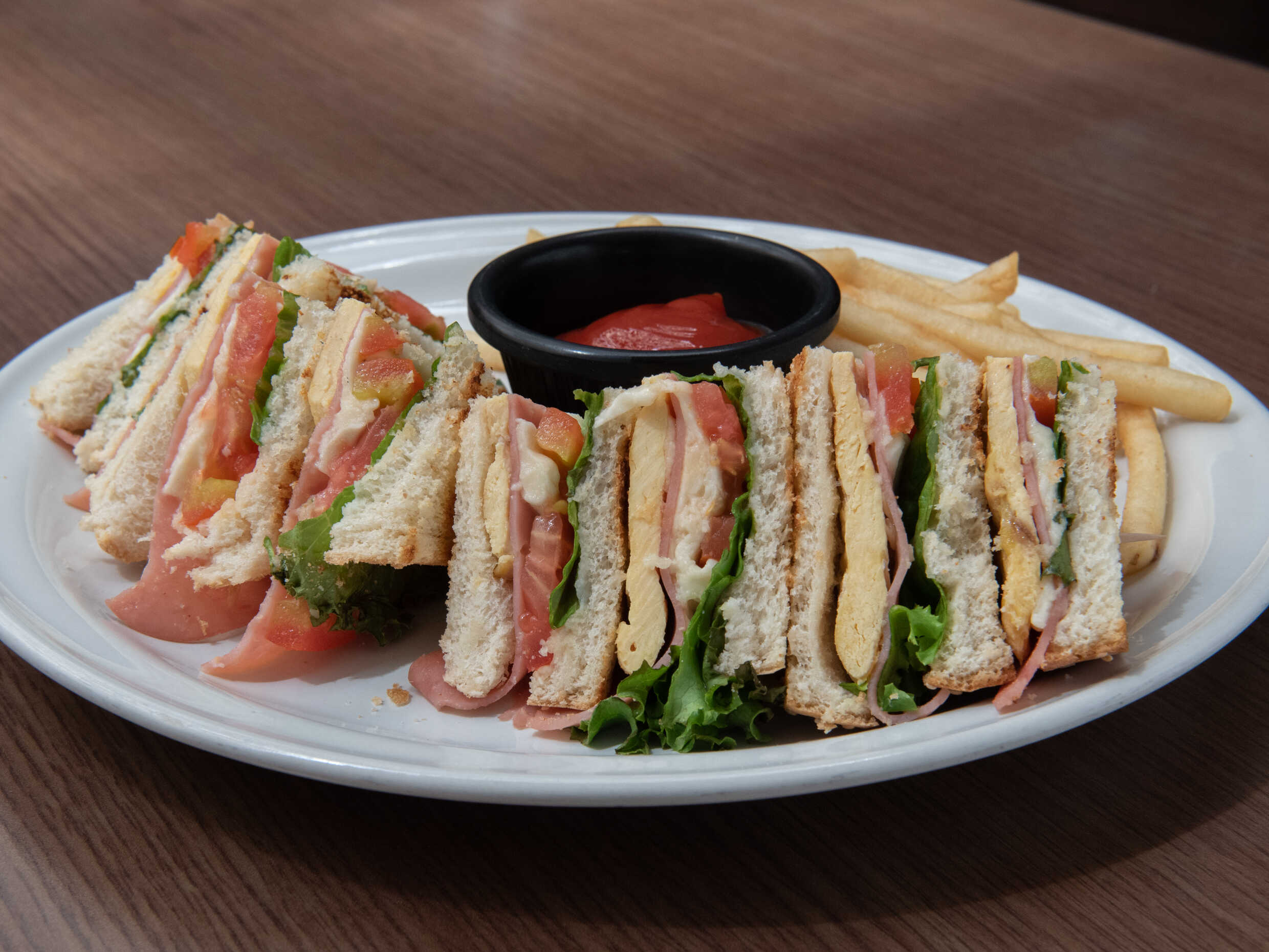 Sándwich con lechuga, jitomate, pollo asado, tocino, jamón, queso oaxaca. Incluye papas a la francesa.