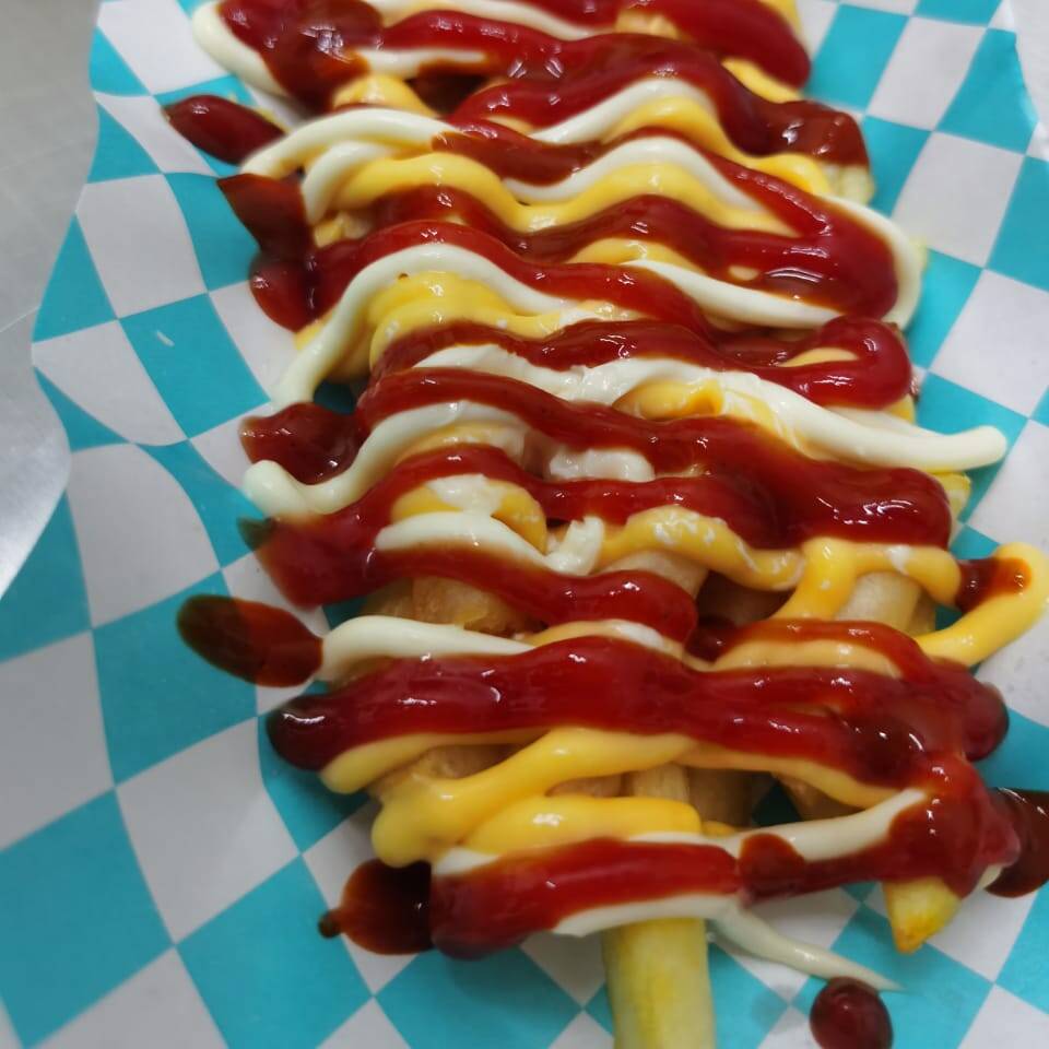 Papas a la francesa preparadas con cátsup, mayonesa, mostaza, queso amarillo, y salsa valentina.