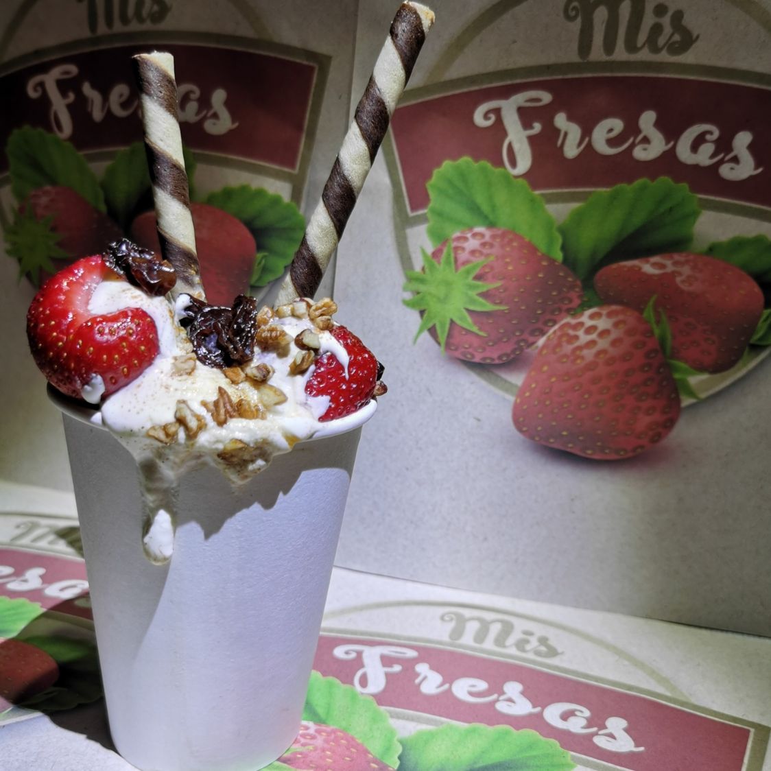 Preparados con fresa, plátano, nuez, pasas, y chocolate hershey's. (Porción Personal)