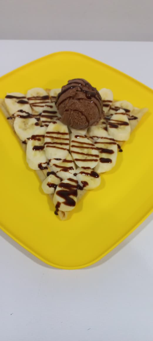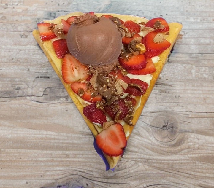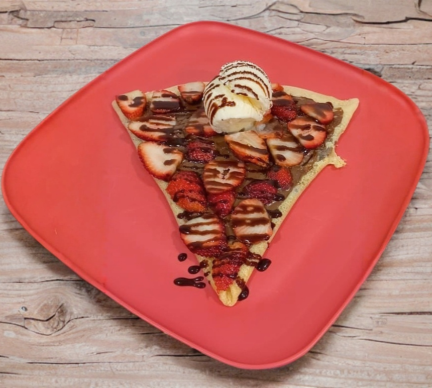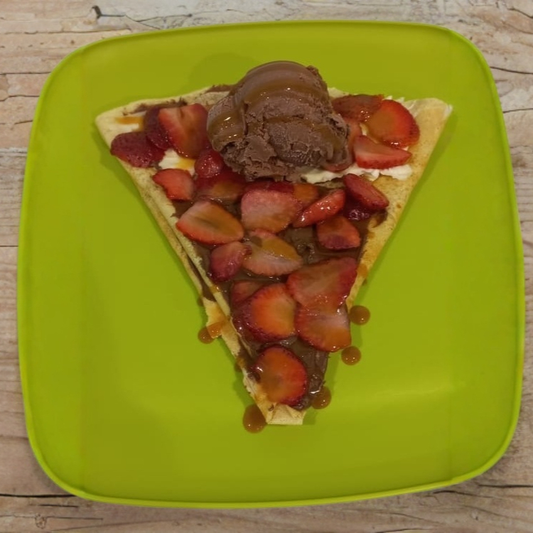 Base Nutella y queso crema, fresas, decorado con caramelo y helado (fresa/chocolate/vainilla).