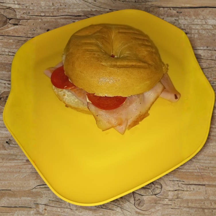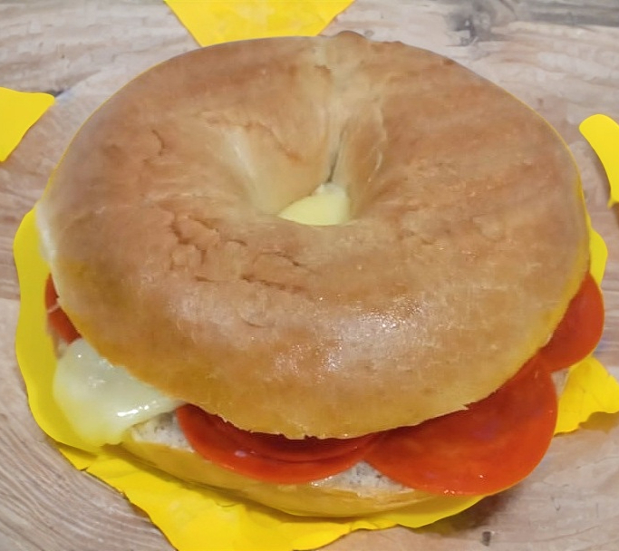 Bagel de pepperoni y queso manchego.