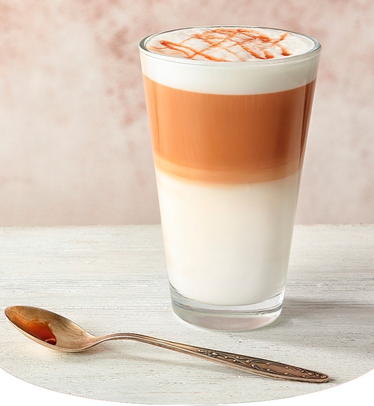 Caramelo, leche, Café expreso, crema batida.