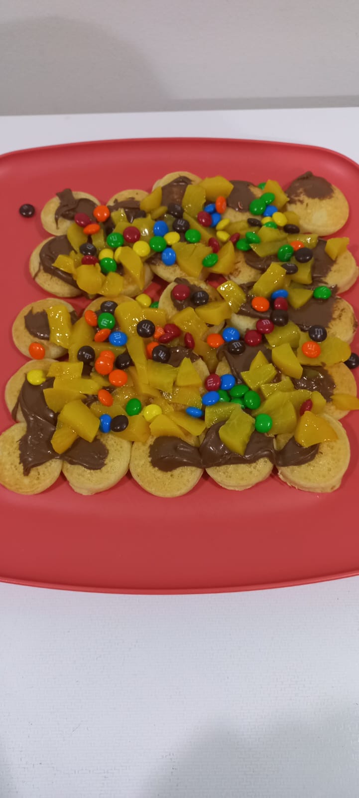 Base Nutella, m&m mini y Hershey’s líquido.