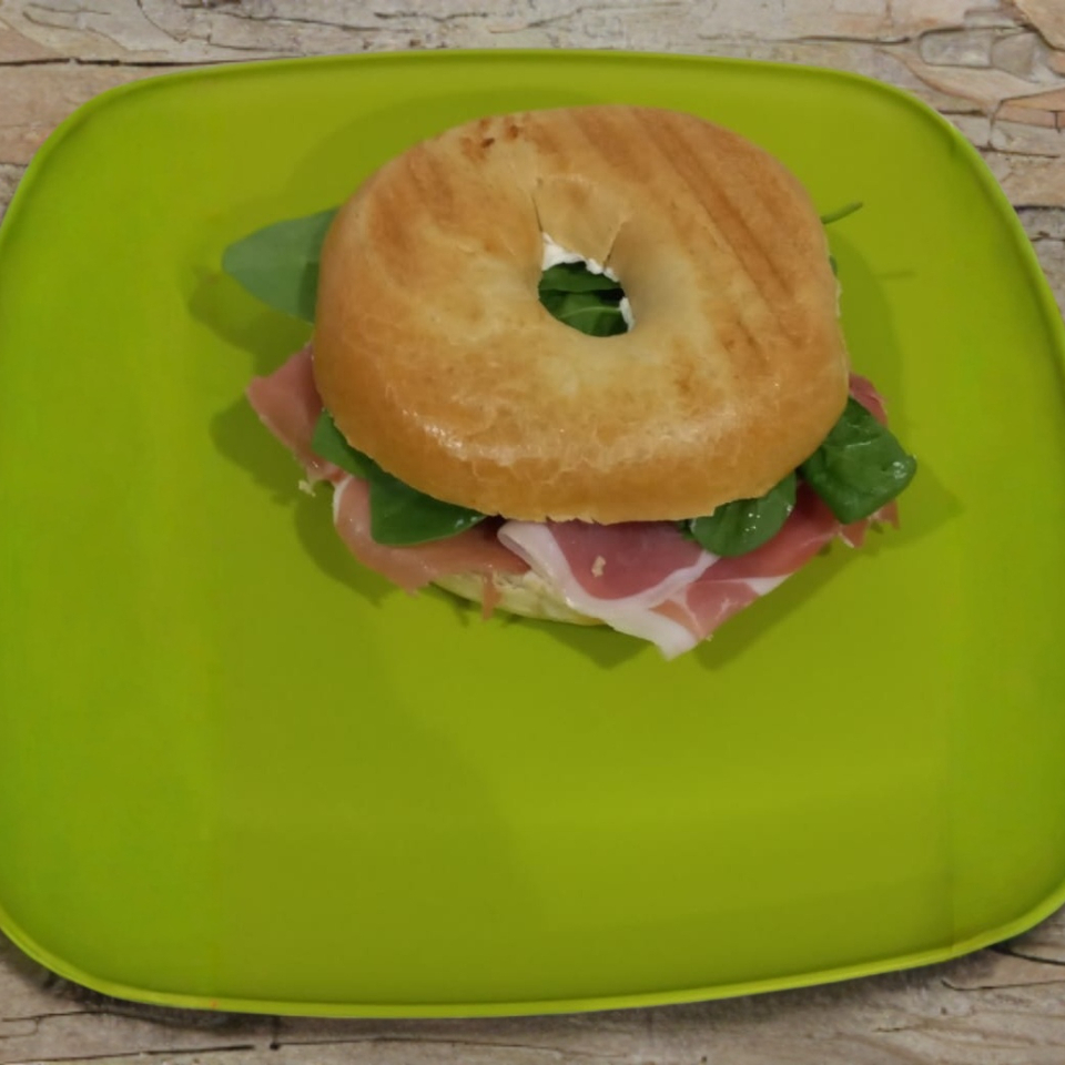 Pan a elegir con jamón serrano, queso crema y espinacas baby.
