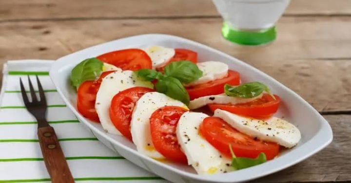 medallones de queso panela y jitomate con aderezo de albahaca