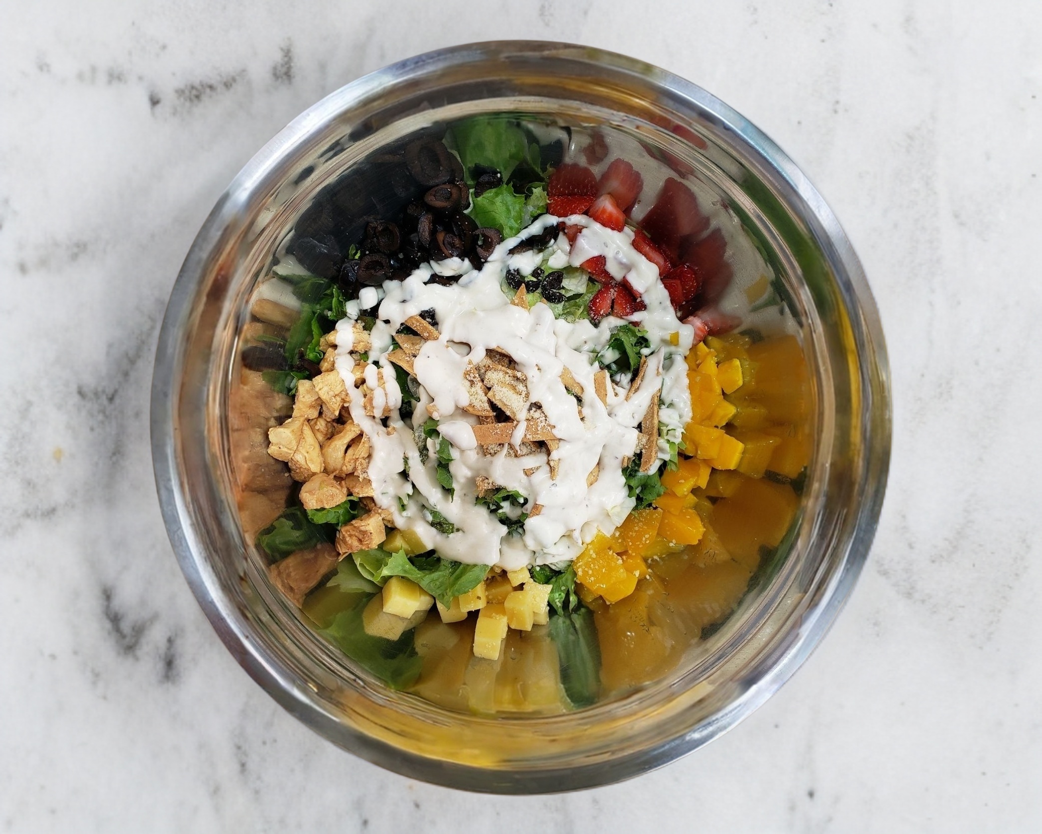 Arma tu ensalada de 2 proteinas | 4 ingredientes | 2 aderezos | 2 toppings. (Porción personal)