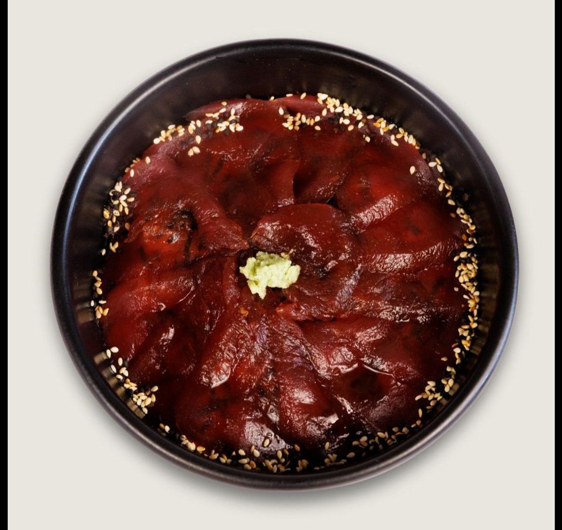 Cortes finos de atún marinados (100g) en salsa de soya con sake, wasabi y ajonjolí sobre arroz shari