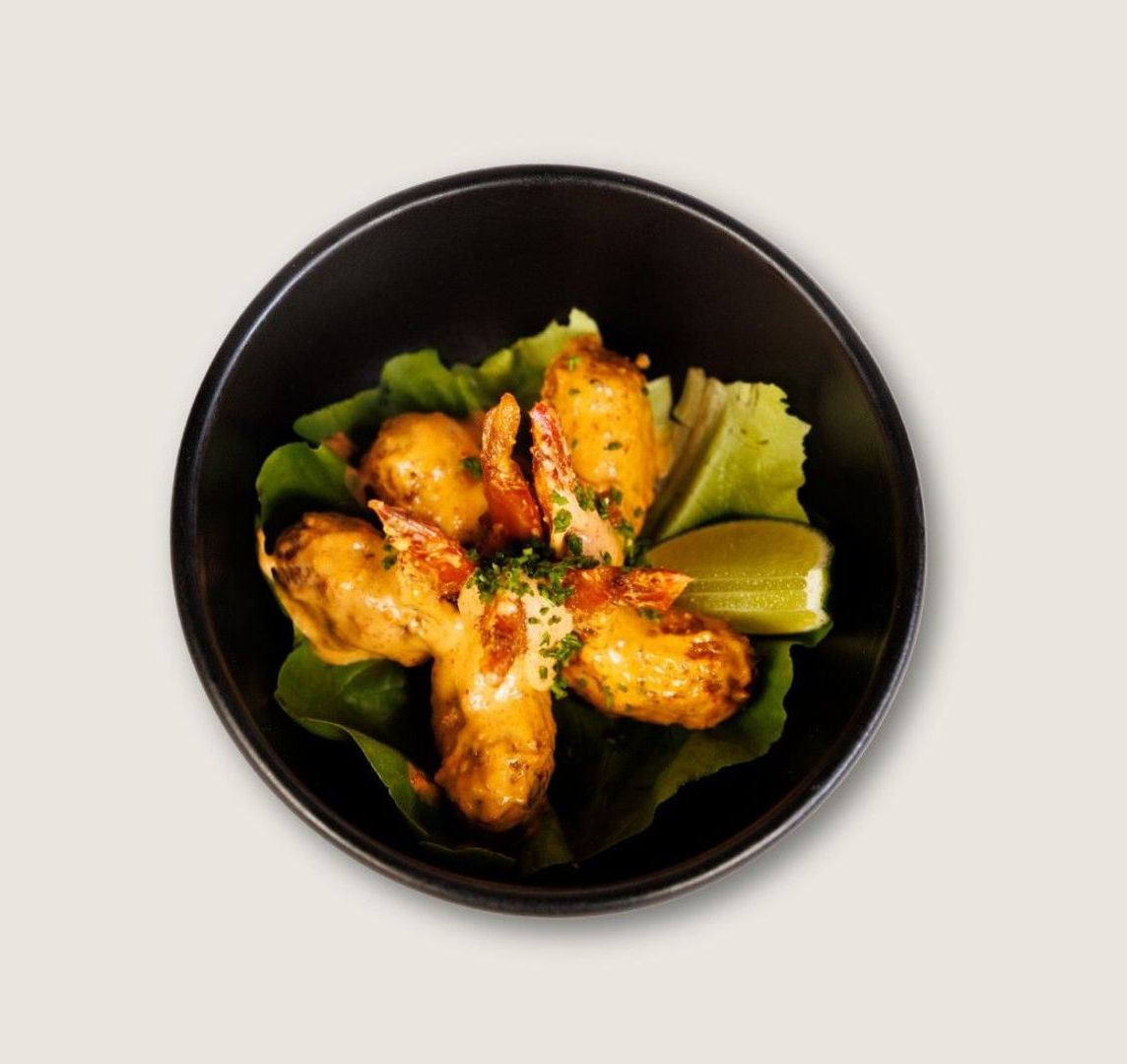 Camarones rebozados (120g) con arare, ralladura de limón amarillo y aderezo Moshi