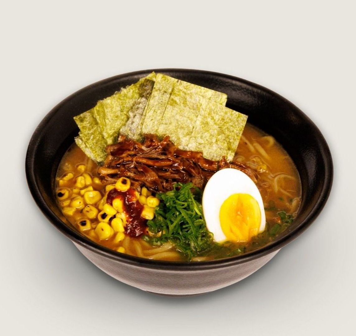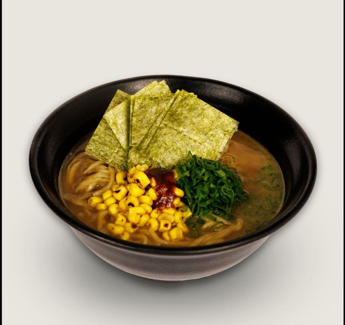 Kale, granos de elote salteados con aceite de ajonjolí, cebollín y nori sobre fideos Ramen en caldo base miso y condimento de salsa de chiles