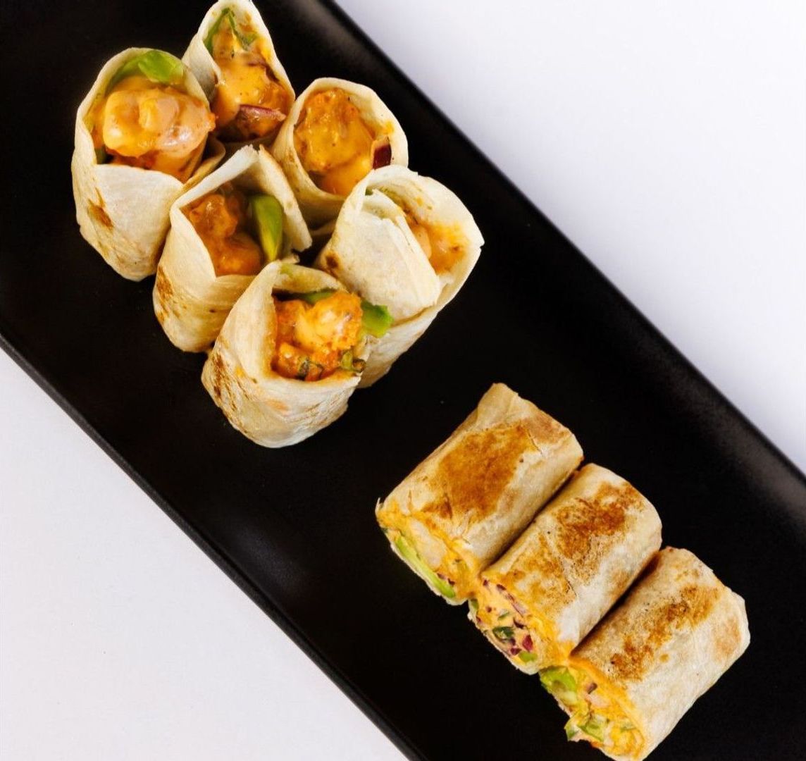 Camarón tempura (90g) con pasta chipotle, aguacate, cebolla morada, chile cuaresmeño y masago en tortilla de harina
