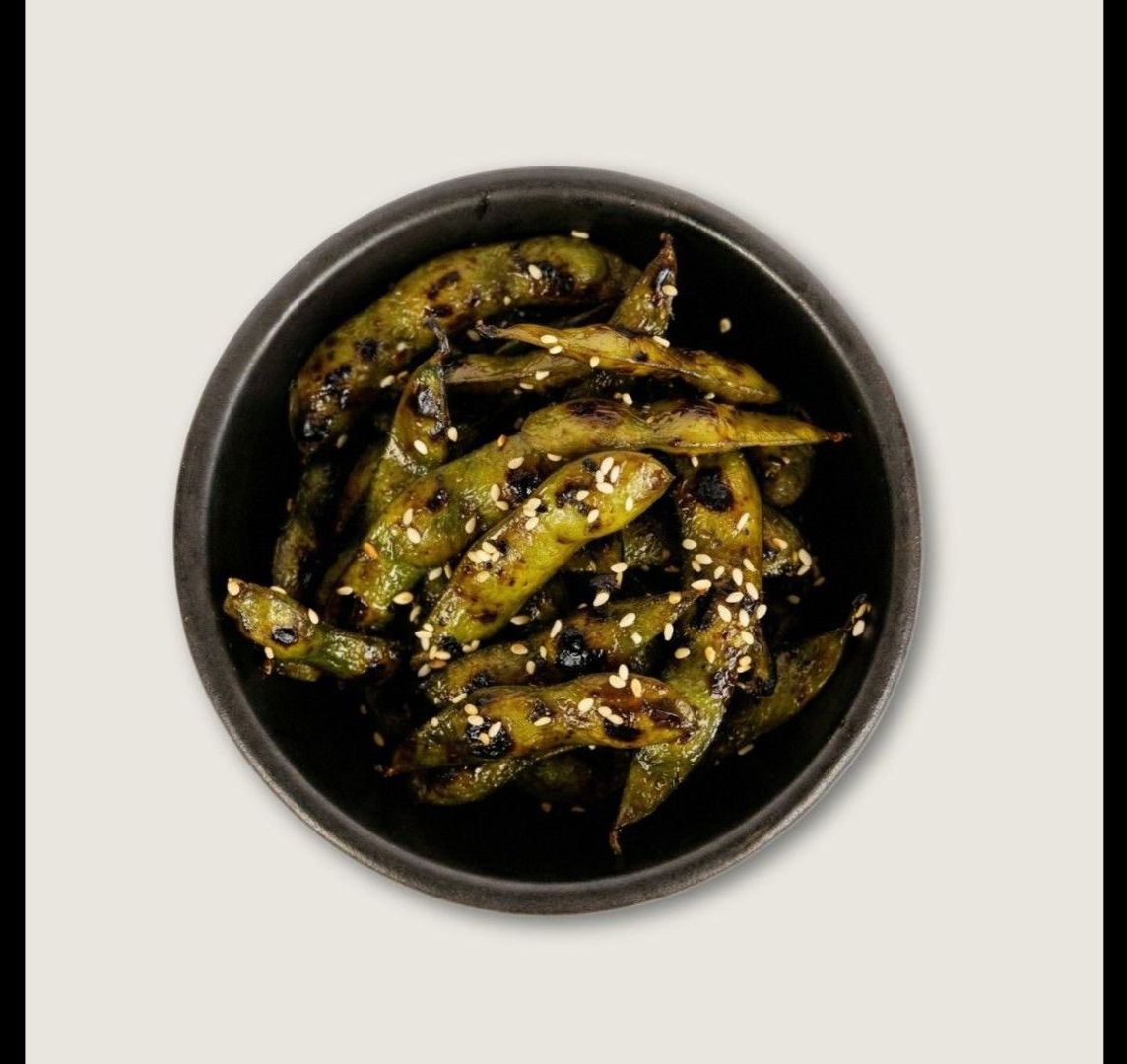 Edamames asados, soya picante, sriracha & ajonjolí tostado