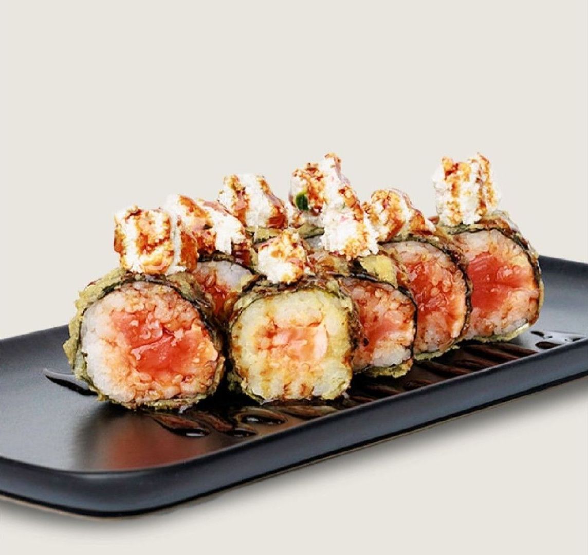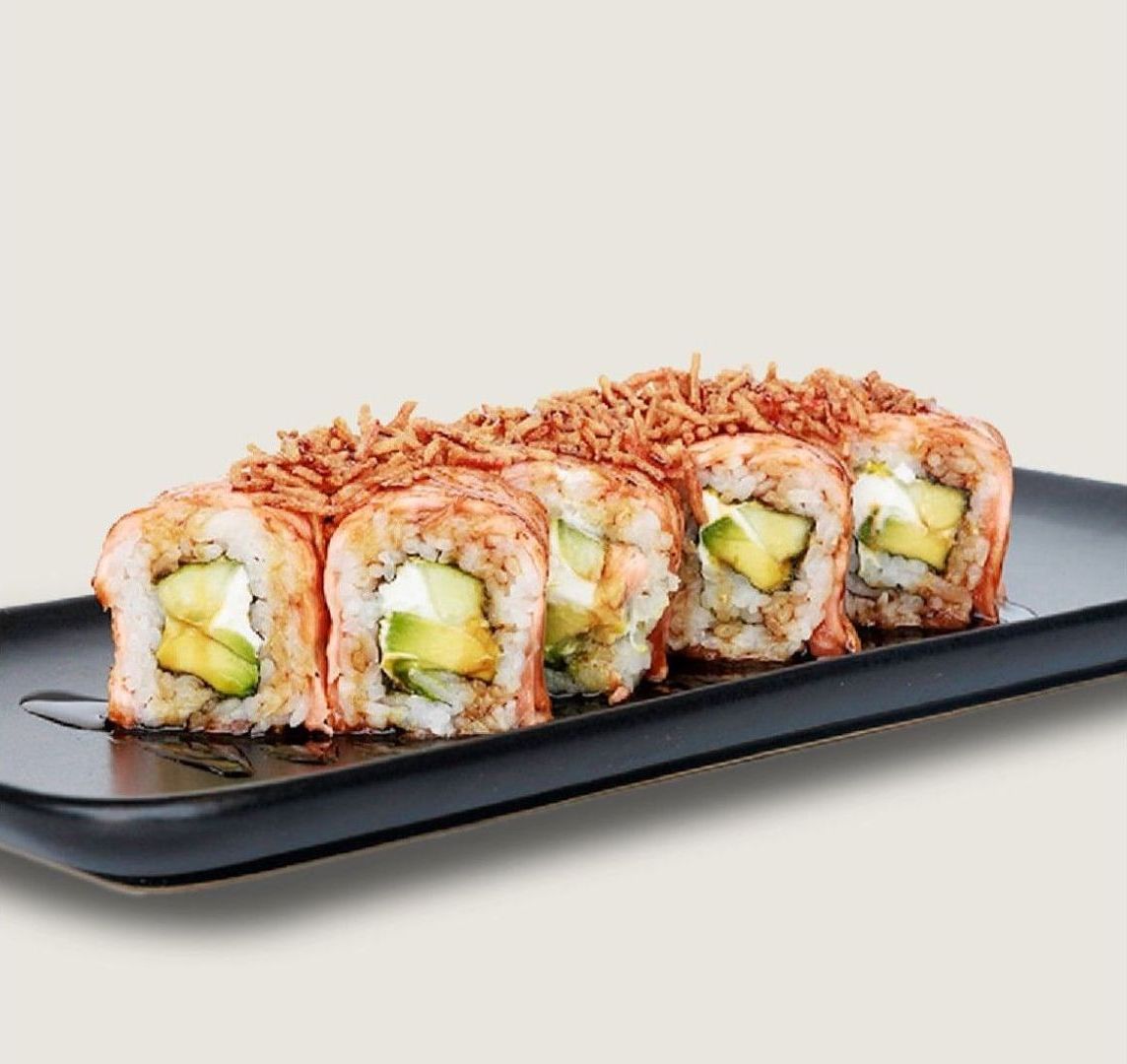 Salmón flameado (50g) y cangrejo frito (18g) con salsa de anguila | Pepino, aguacate, queso Philadelphia (8 pzas)