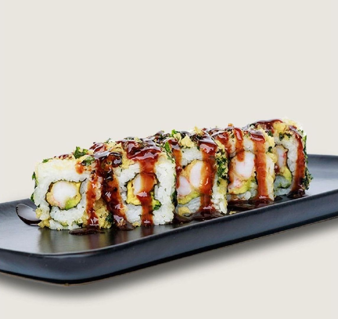 Kale tempura y salsa teriyaki spicy | Camarón tempura y aguacate (8 pzas)