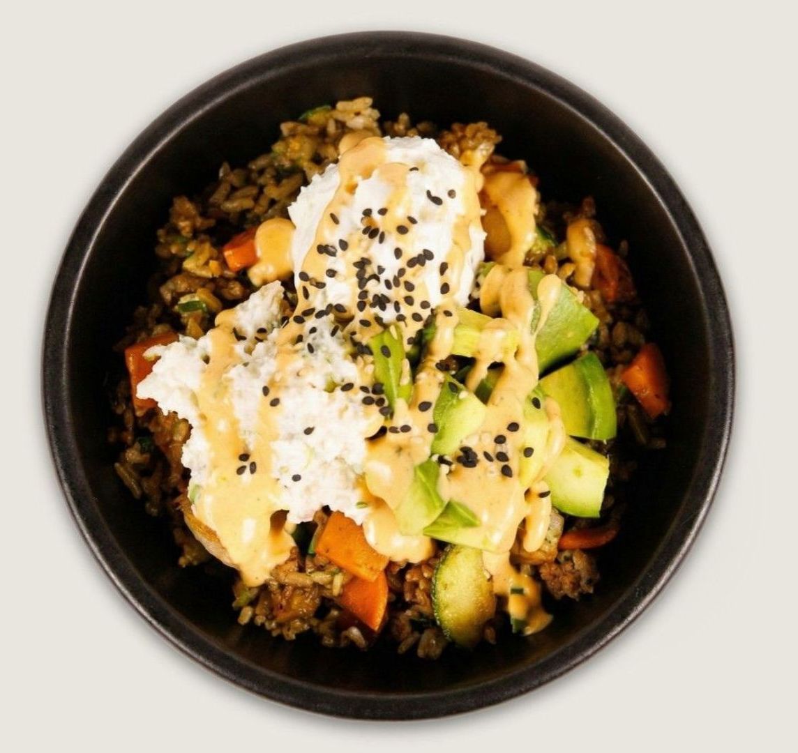 Yakimeshi mixto con aguacate, queso philadelphia, tampico y mayonesa chipotle