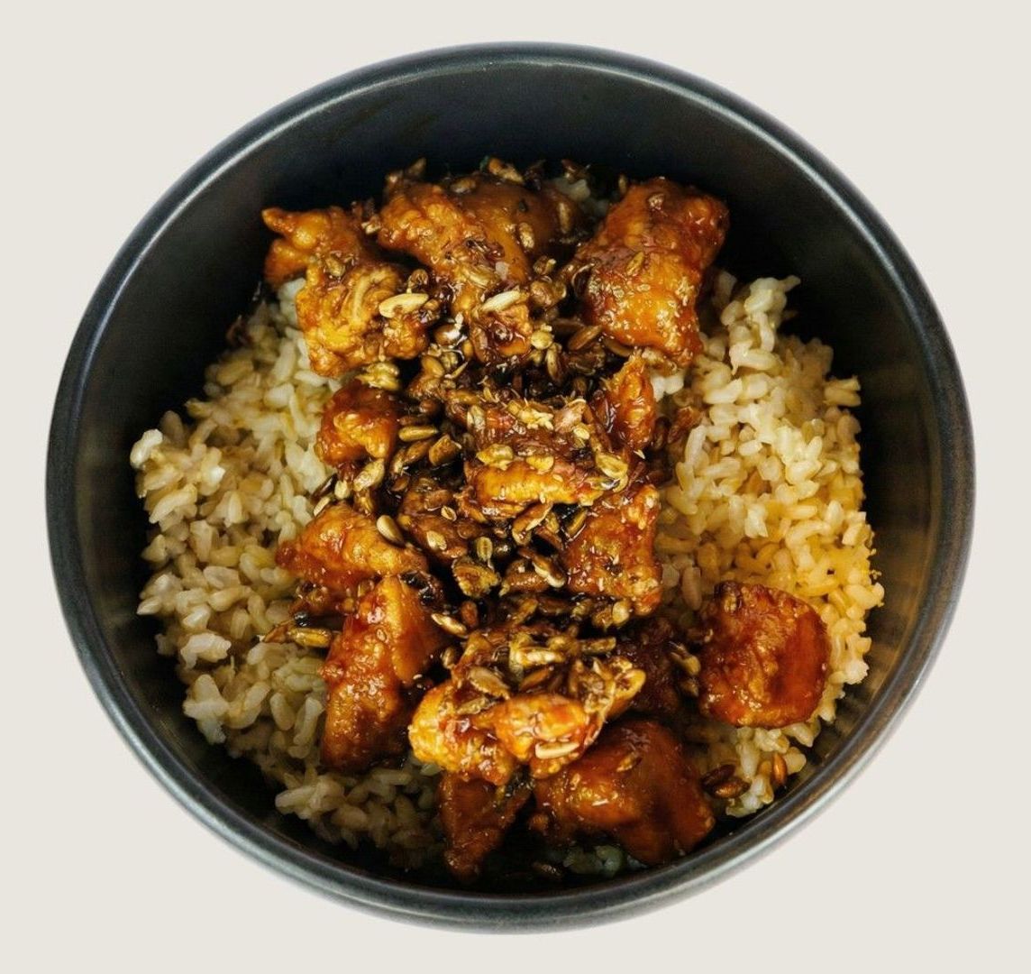 Pollo (150g) marinado en salsa de jengibre, soya y teriyaki spicy con semillas de girasol y ralladura de limón amarillo sobre arroz shari.
