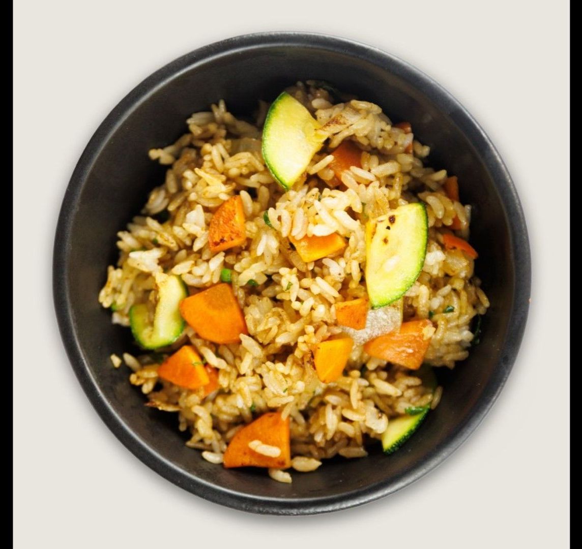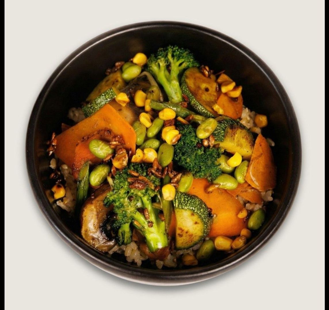 Kale, edamames, espárragos, brócoli, camote, calabaza, zanahoria, chícharos, granos de elote y portobello al wok sobre arroz integral con semillas de girasol