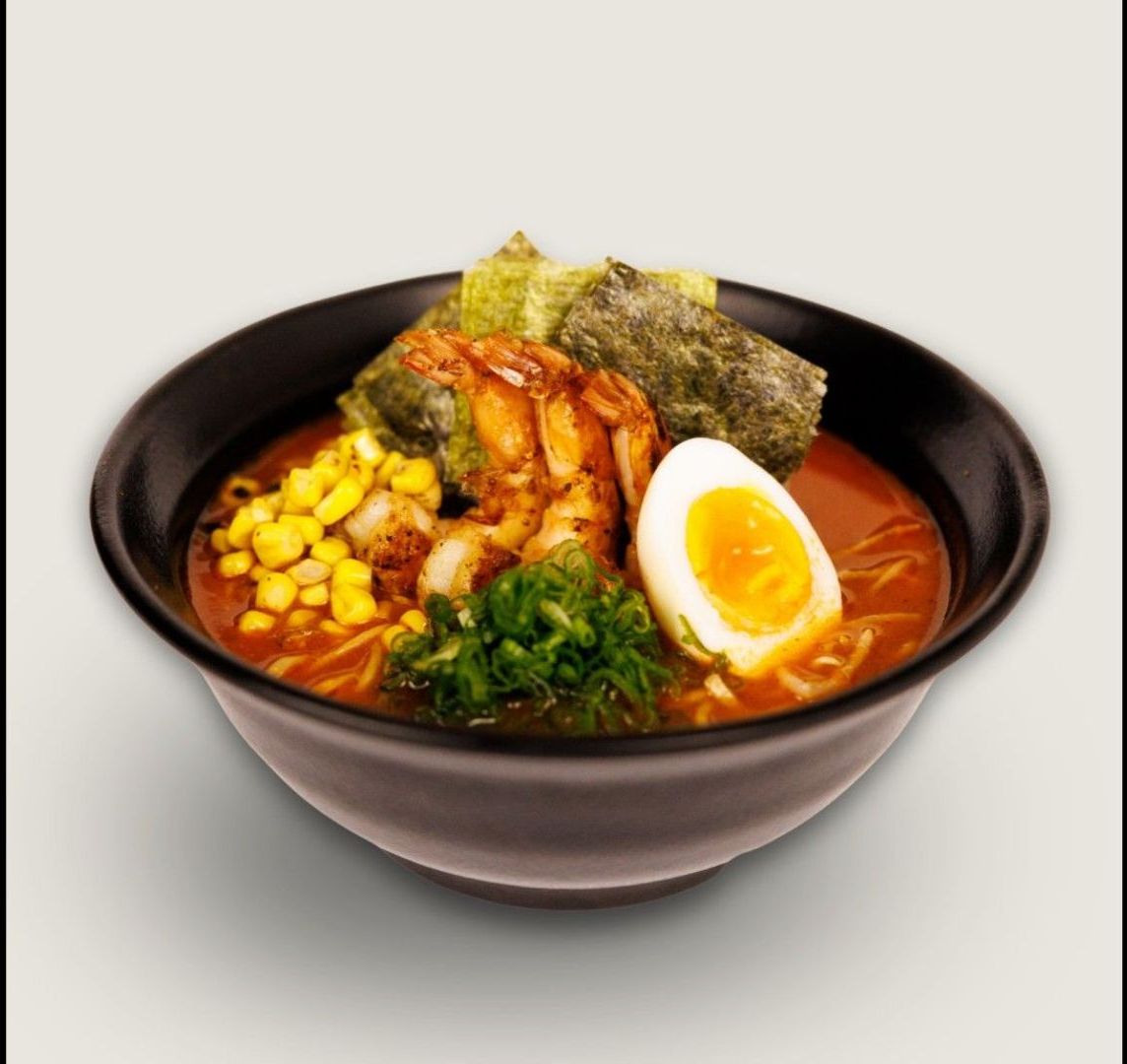 Camarones (3 piezas), kale, granos de elote , huevo cocido y cebollín sobre fideos Ramen en caldo picante de pescado