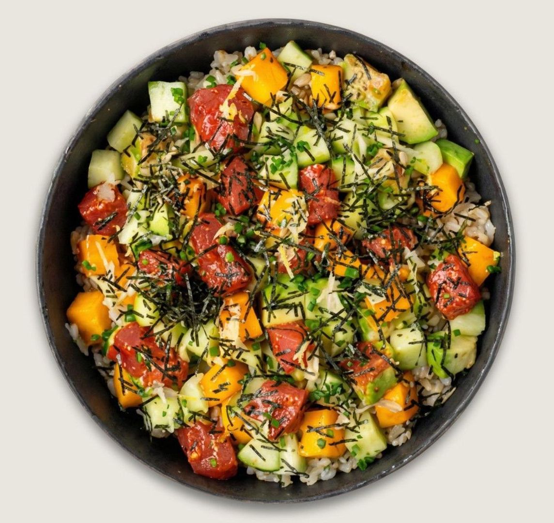 Tartar de atún spicy, pepino, aguacate, cebollín, semilla de girasol, ralladura de limón amarillo, mango, kizami nori, salsa spicy y arroz shari