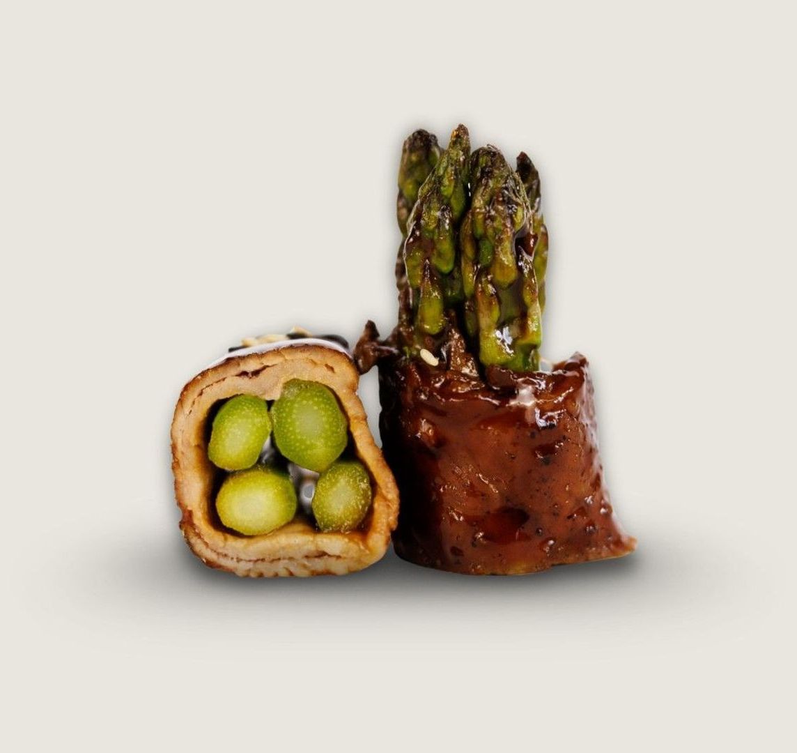 Rollo de rib eye (75g) con espárragos, salsa teriyaki y ajonjolí