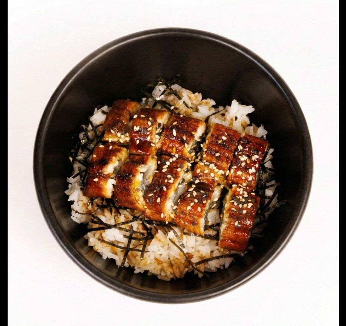 Cortes de anguila horneada (110g) con salsa de anguila, ajonjolí y Kizami Nori sobre arroz gohan