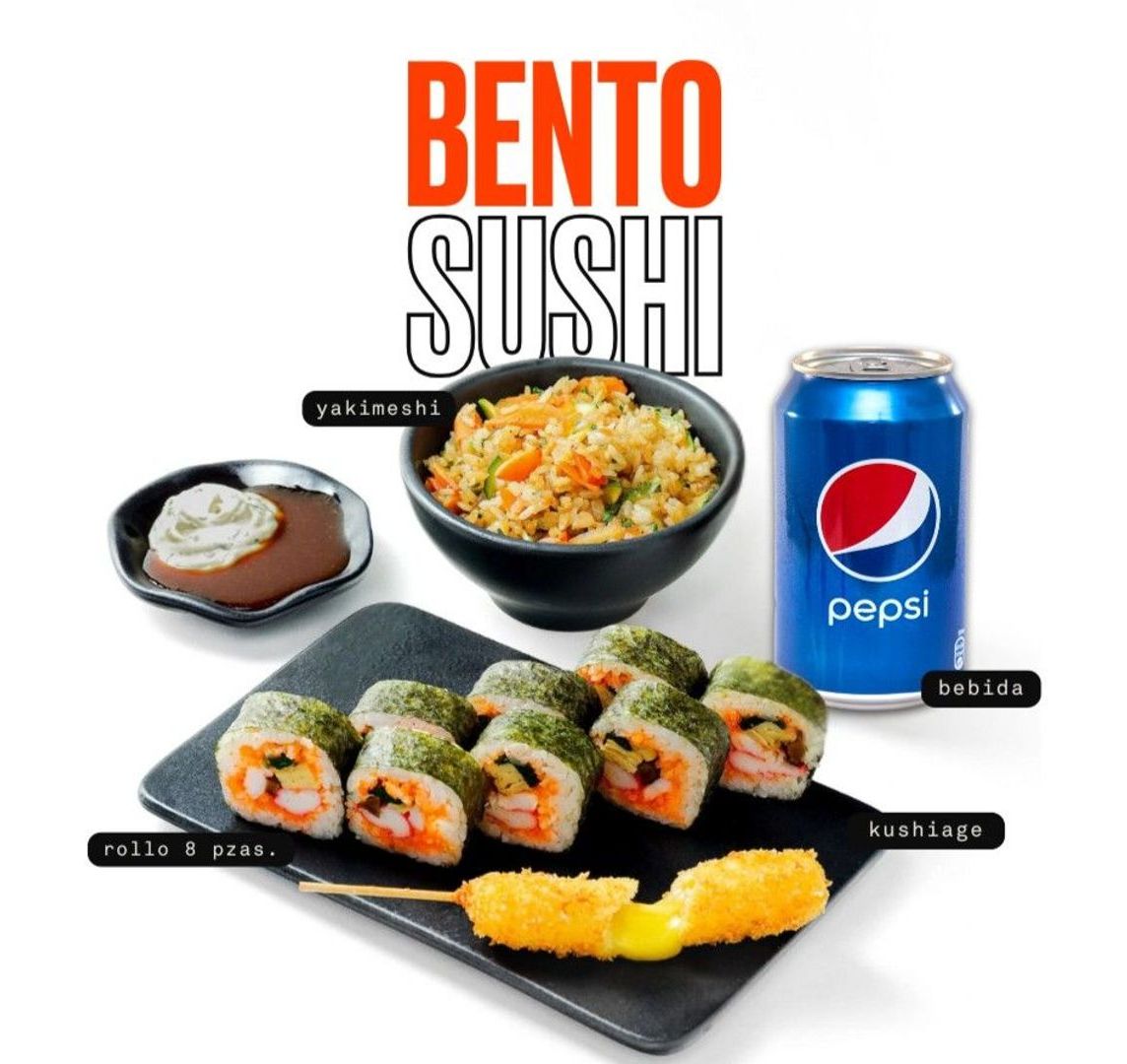 El paquete perfecto para tu antojo japonés. Sushi de 8 pzas + Kushiage de queso + Yakimeshi a elegir + refresco