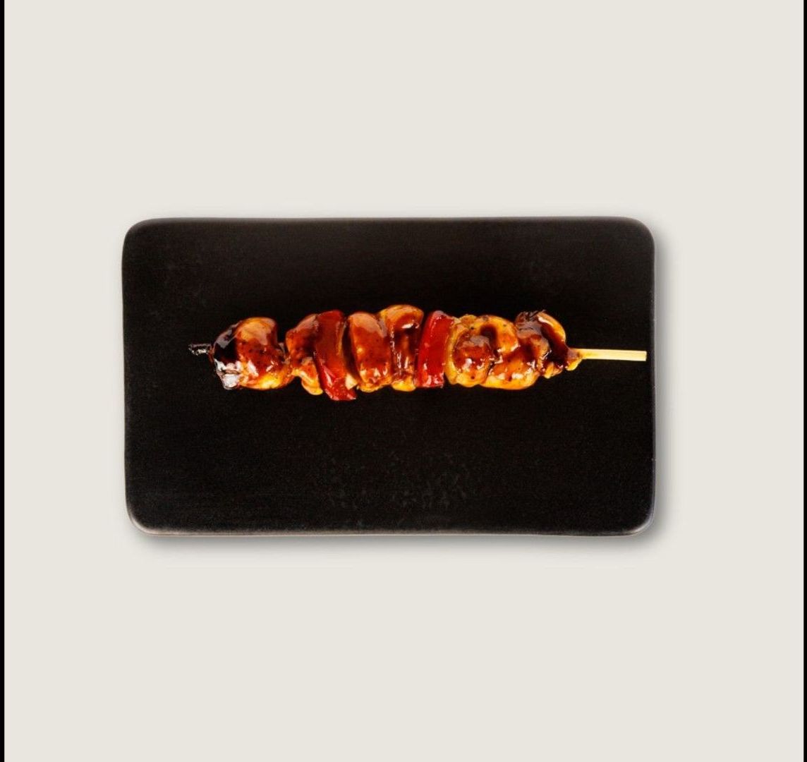 Brocheta asada de pollo (40g), pimiento y cebolla con salsa teriyaki