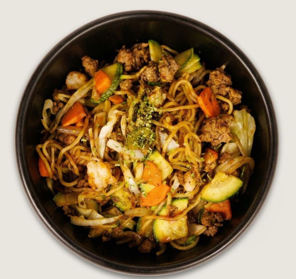 Fideos delgados asados en salsa de soya con carne molida (40g), camarón (40g), verduras mixtas y aonori