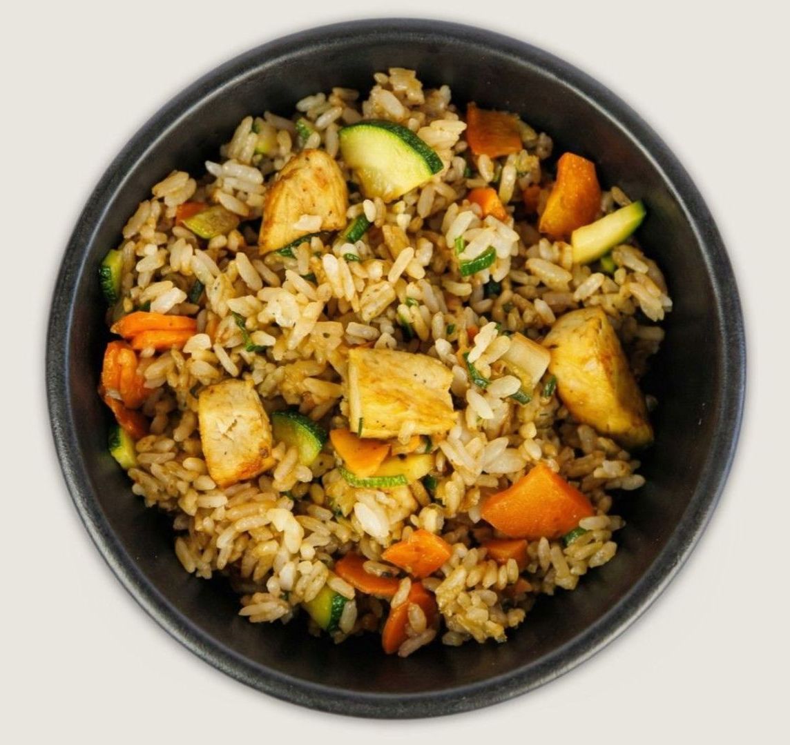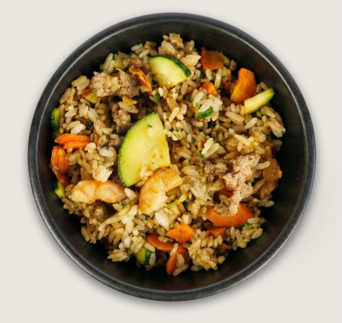 Arroz asado con carne molida (30g), camarón (20g) y verduras
