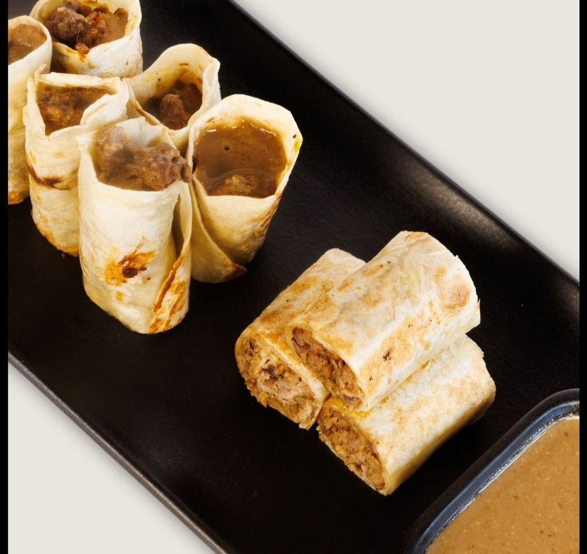 Rib eye asado (150g) con salsa de ajonjolí, cebolla morada y cebollín en tortilla de harina