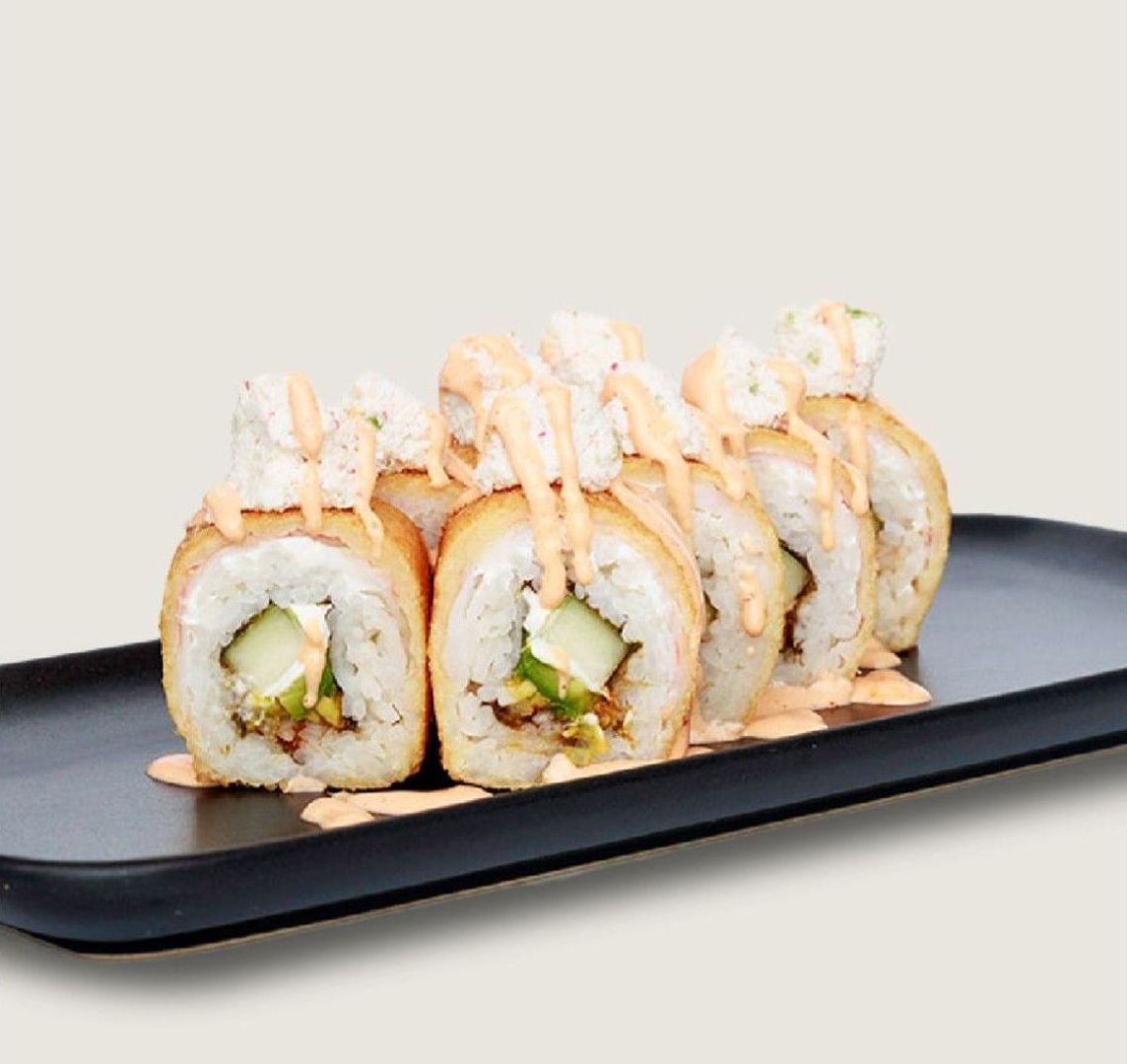 Plátano macho empanizado, tampico y salsa spicy Moshi, Camarón (25g), shiitake, queso Philadelphia, y pepino (8 pzas)