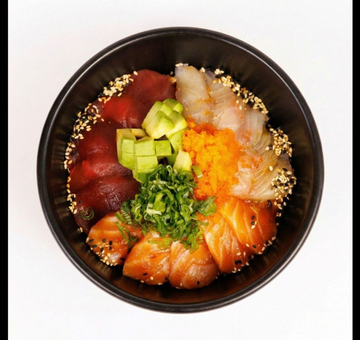 Cortes de atún (40g), salmón (40g), lobina (40g), masago, aguacate, pepino, cebollín, ajonjolí y aderezo moshi de chipotle sobre arroz shari.(200g)