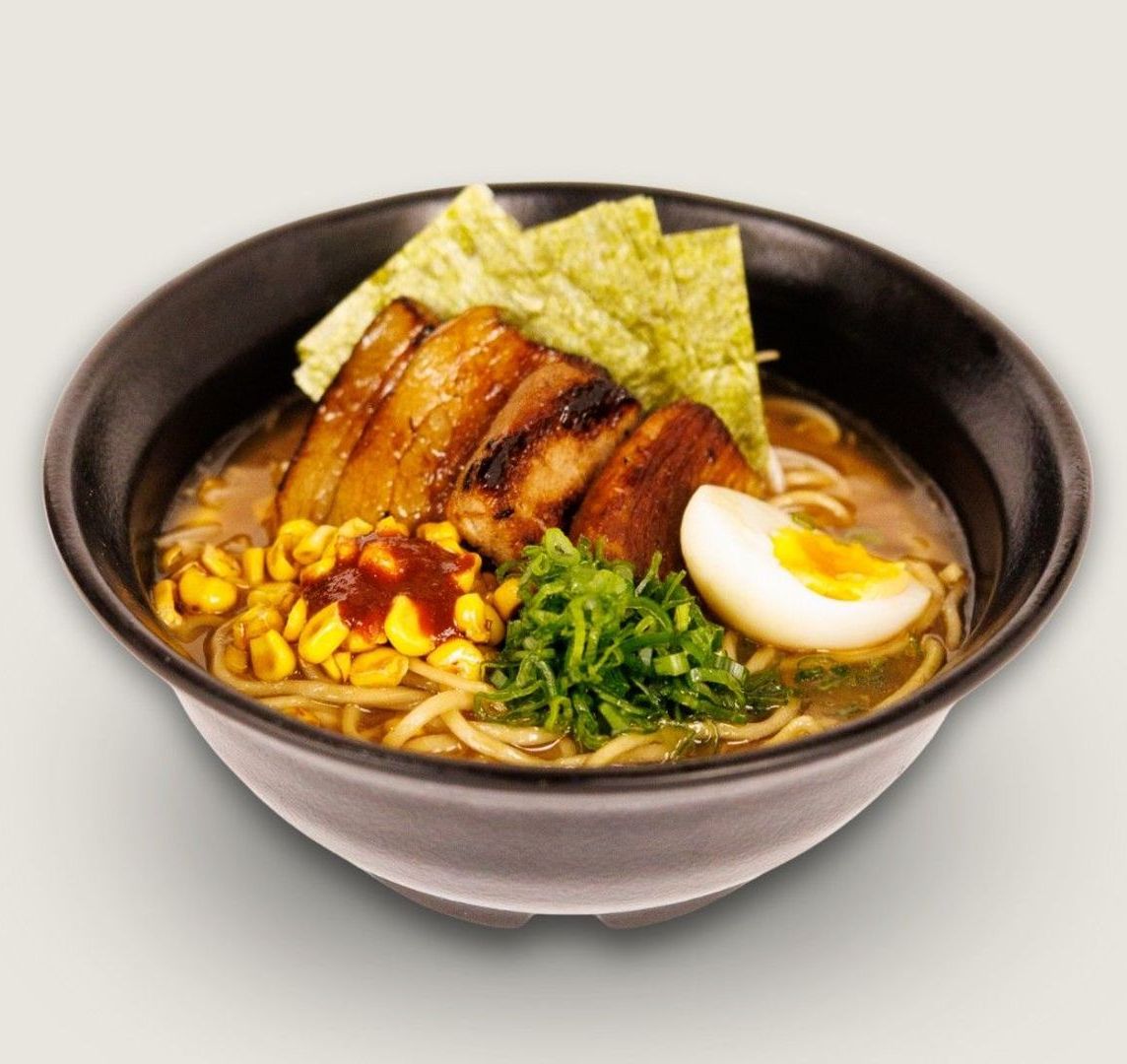 Porkbelly (50g) marinado en soya y jengibre, granos de elote y cebollín sobre fideos Ramen en caldo base de cerdo y condimento de salsa de chiles