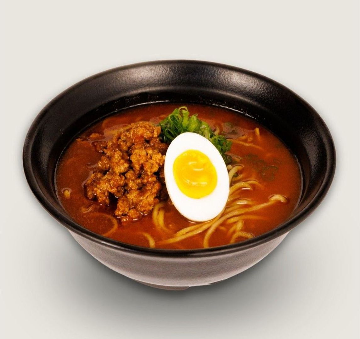 Carne molida (100g) marinada en salsa de chiles, cebollín y huevo cocido sobre fideos Ramen