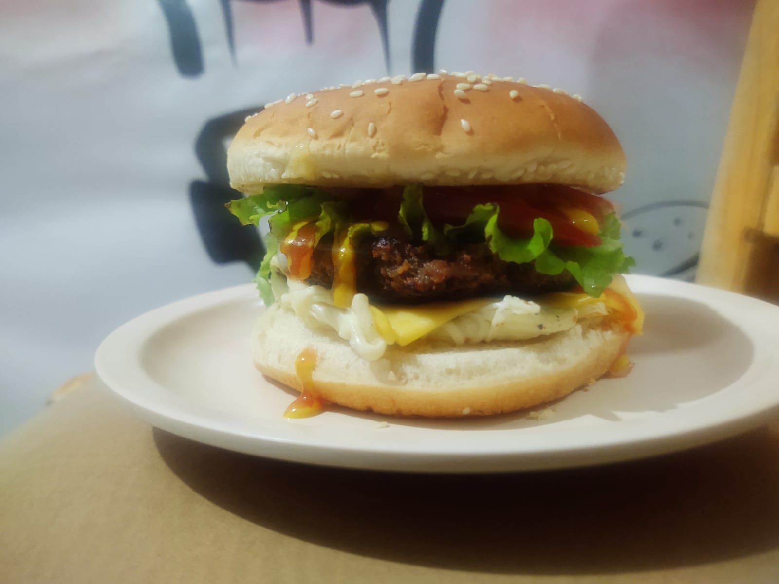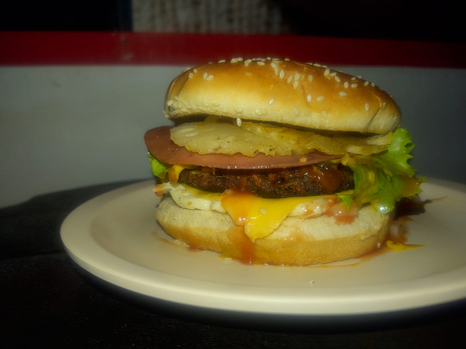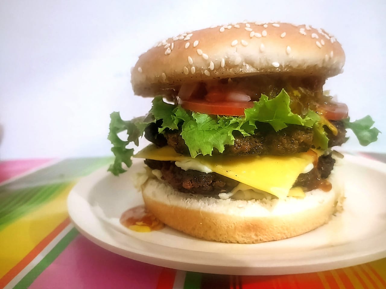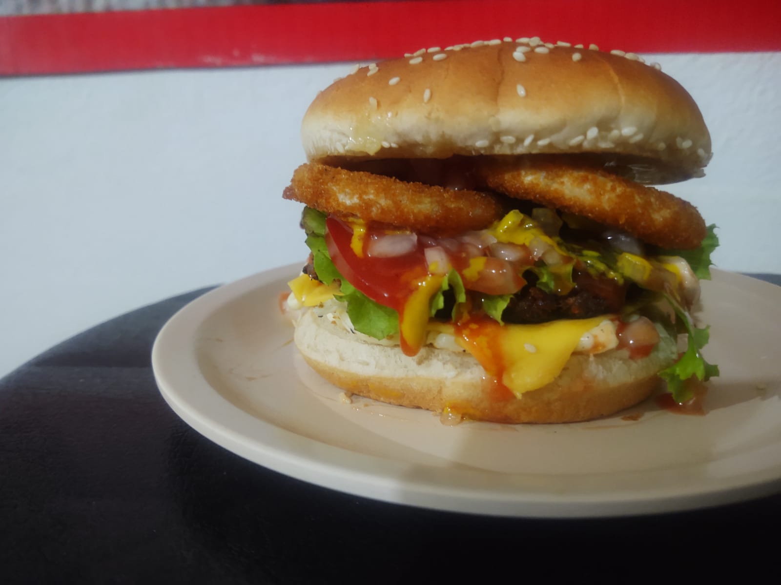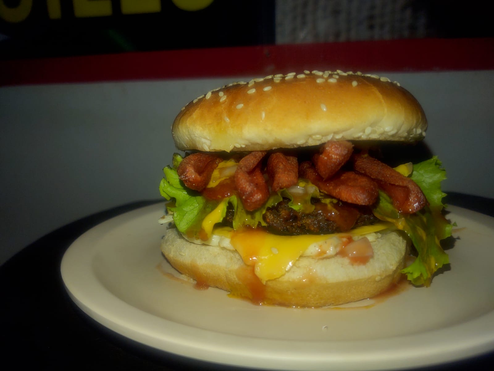 Doble carne, queso Oaxaca y queso amarillo, jitomate, cebolla, picante, lechuga, cátsup, mostaza y mayonesa.