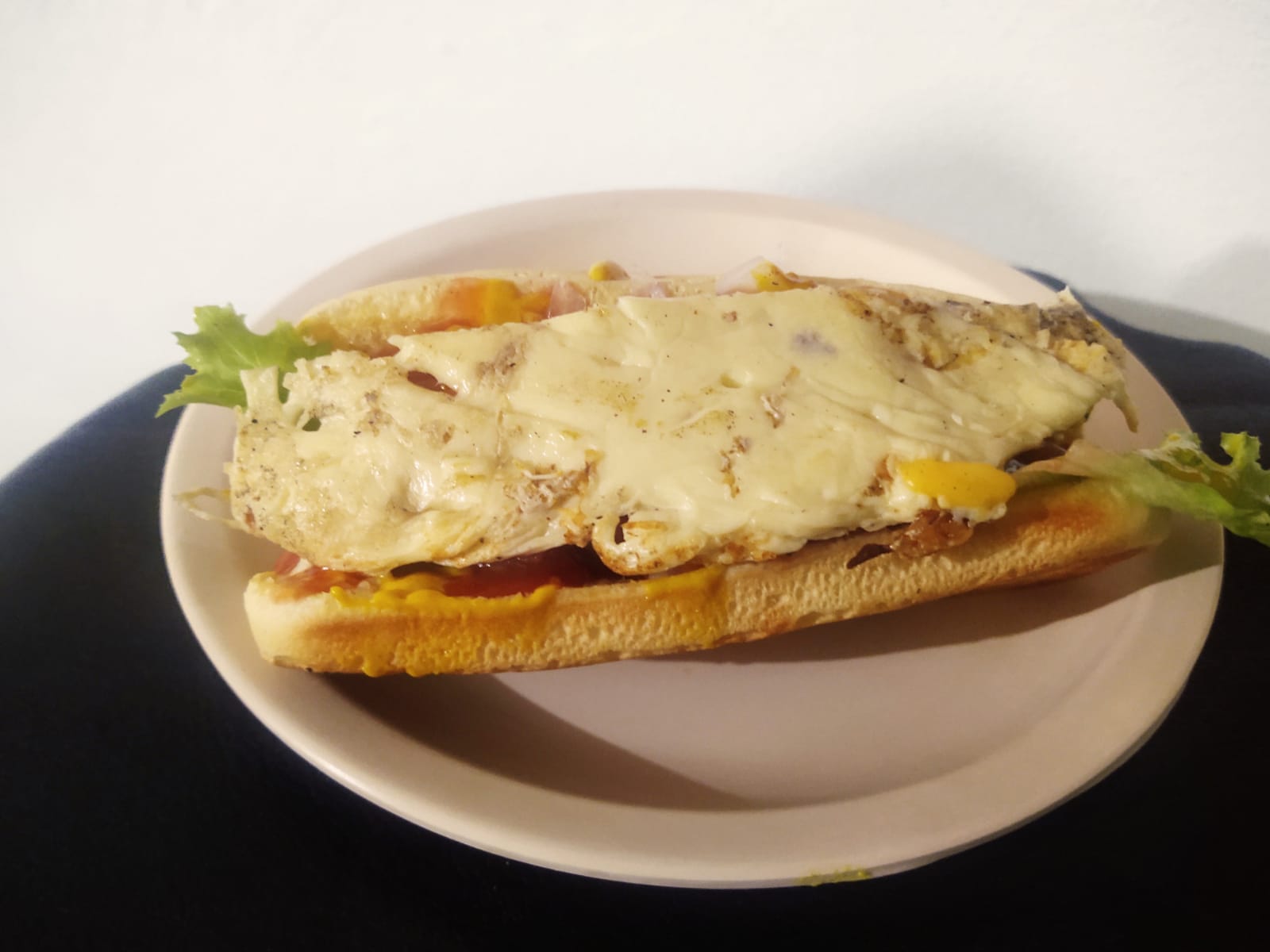 Carne de pollo empanizada, queso Oaxaca y queso amarillo, jitomate, cebolla, picante, lechuga, cátsup, mostaza y mayonesa.
