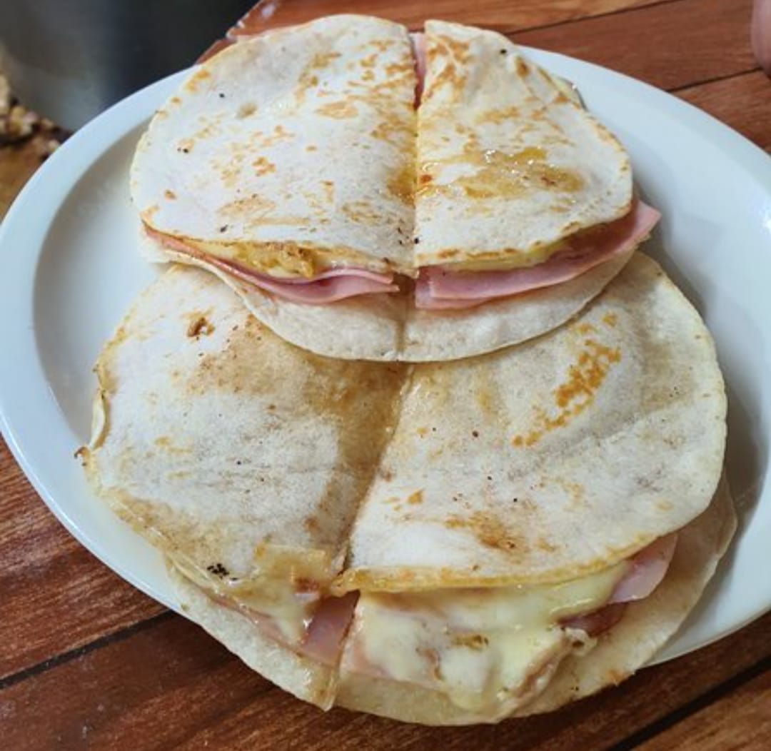 Preparada con dos tortillas de harina,jamón,Q.Amarillo y Q.Oaxaca, lechuga catsup