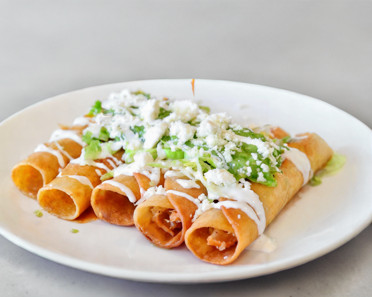 4 tacos dorados de pollo acompañados de ensalada de lechuga, queso rallado y crema ácida