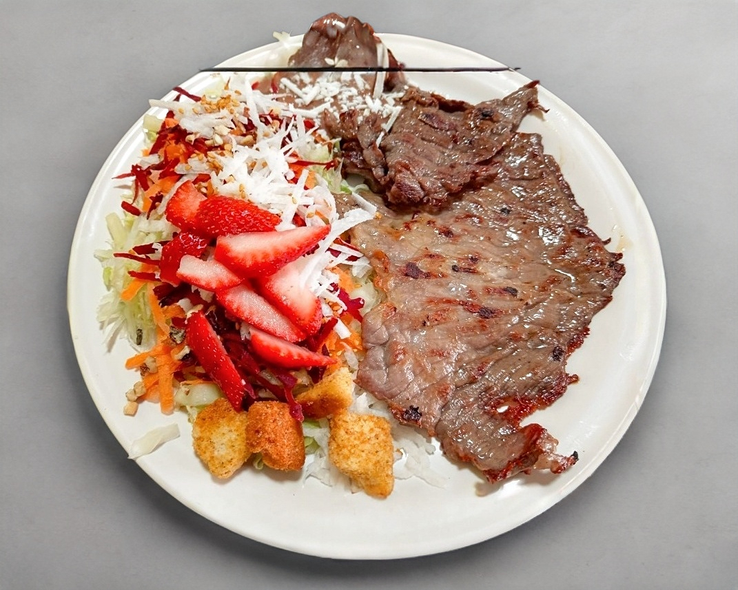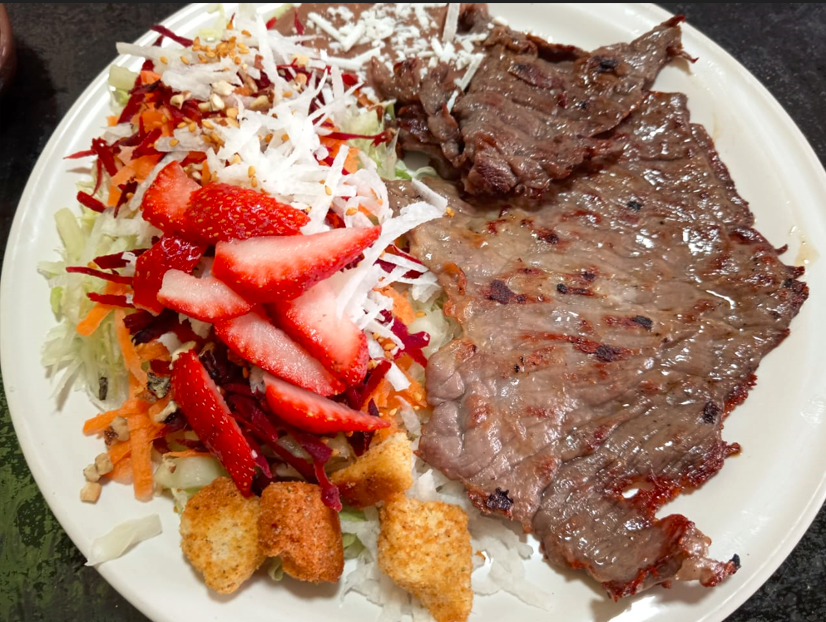 "150 grs de cecina de res asada a la plancha: + Lechuga + Zanahoria rallada + Betabel rallado + Manzana o fresa + Ajonjolí tostado + Crotones de pan tostado"