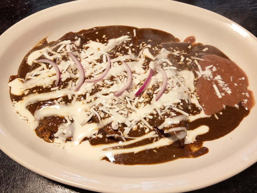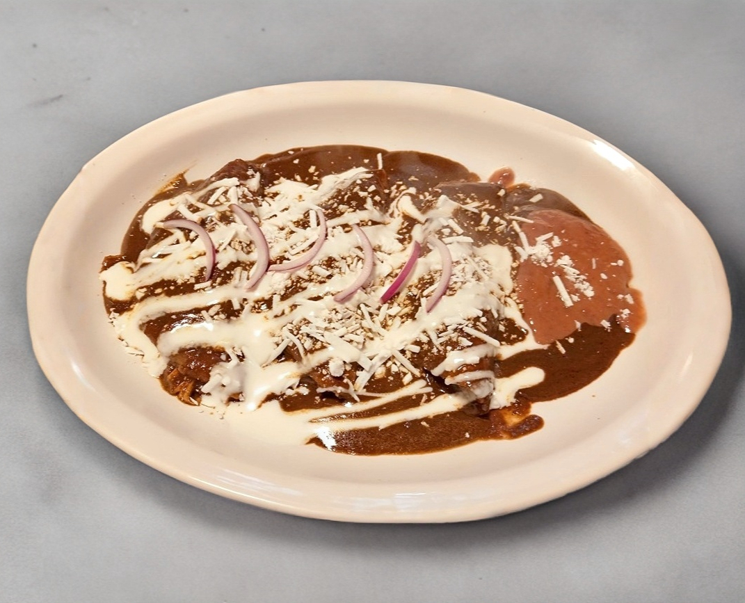3 Enchiladas con 150 grs de pollo y cubiertas con nuestro Mole o Suizas gratinadas con Queso Manchego + Frijoles refritos + Queso rallado + Crema ácida