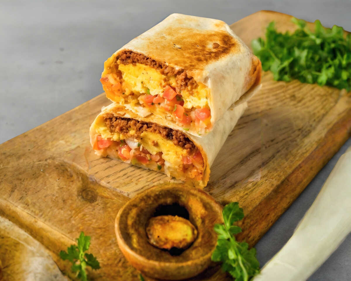 Delicioso emparedado en tortilla de harina, arroz, frijoles, lechuga, jitomate, cebolla, aguacate + proteína a elegir entre asada de cerdo, chorizo, o pollo + papa tipo ruffle