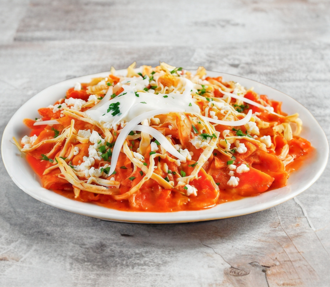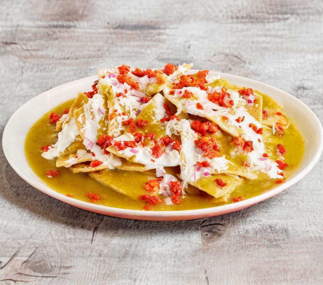300 grs de totopos cubiertos con nuestro Mole Rojo, Salsa Verde o Roja; Gratinados con Queso Manchego o Combinados + Frijoles refritos + Queso rallado + Crema ácida + Aguacate + 1 taza de café de olla + 1 porción de fruta de temporada