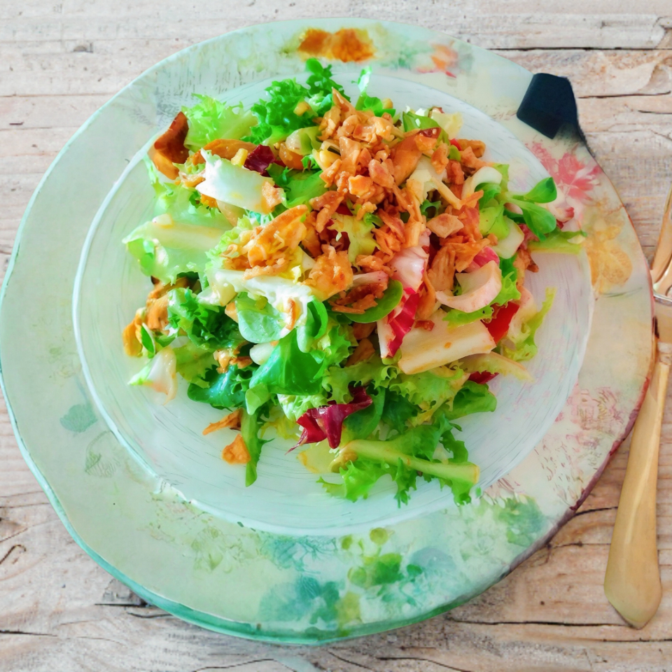 150 grs de pechuga de pollo empanizada y frita en la plancha: + Lechuga + Zanahoria rallada + Betabel rallado + Manzana + Ajonjolí tostado + Crotones de pan tostado"