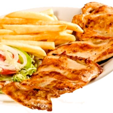 150 grs de pechuga de pollo asada a la plancha + Papas fritas o Ensalada (Lechuga + Zanahoria rallada + Betabel rallado + Manzana + Ajonjolí tostado)