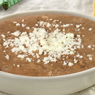 Totopos de maíz, bañados en nuestra deliciosa salsa + frijolitos refritos + 1 tasa café de olla + 1 porción fruta de temporada