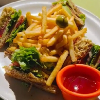 Pan blanco bimbo, pollo, jamón, tocino, lechuga, jitomate, cebolla, mayonesa y queso manchego. A elegir acompañado de porción papas fritas o porción de ensalada