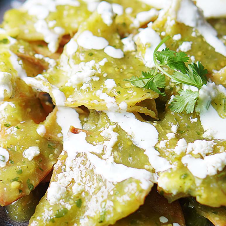 300 grs de totopos cubiertos con nuestra salsa especial roja o verde + Frijoles refritos + Queso rallado + Crema ácida + Aguacate