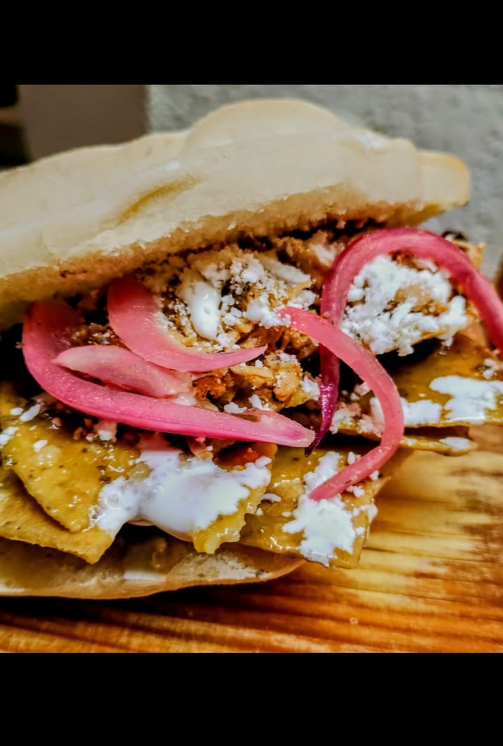Torta de chilaquiles con cochinita pibil.