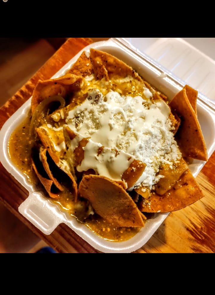 Orden de chilaquiles verdes con cochinita pibil. Acomodados con crema y queso.