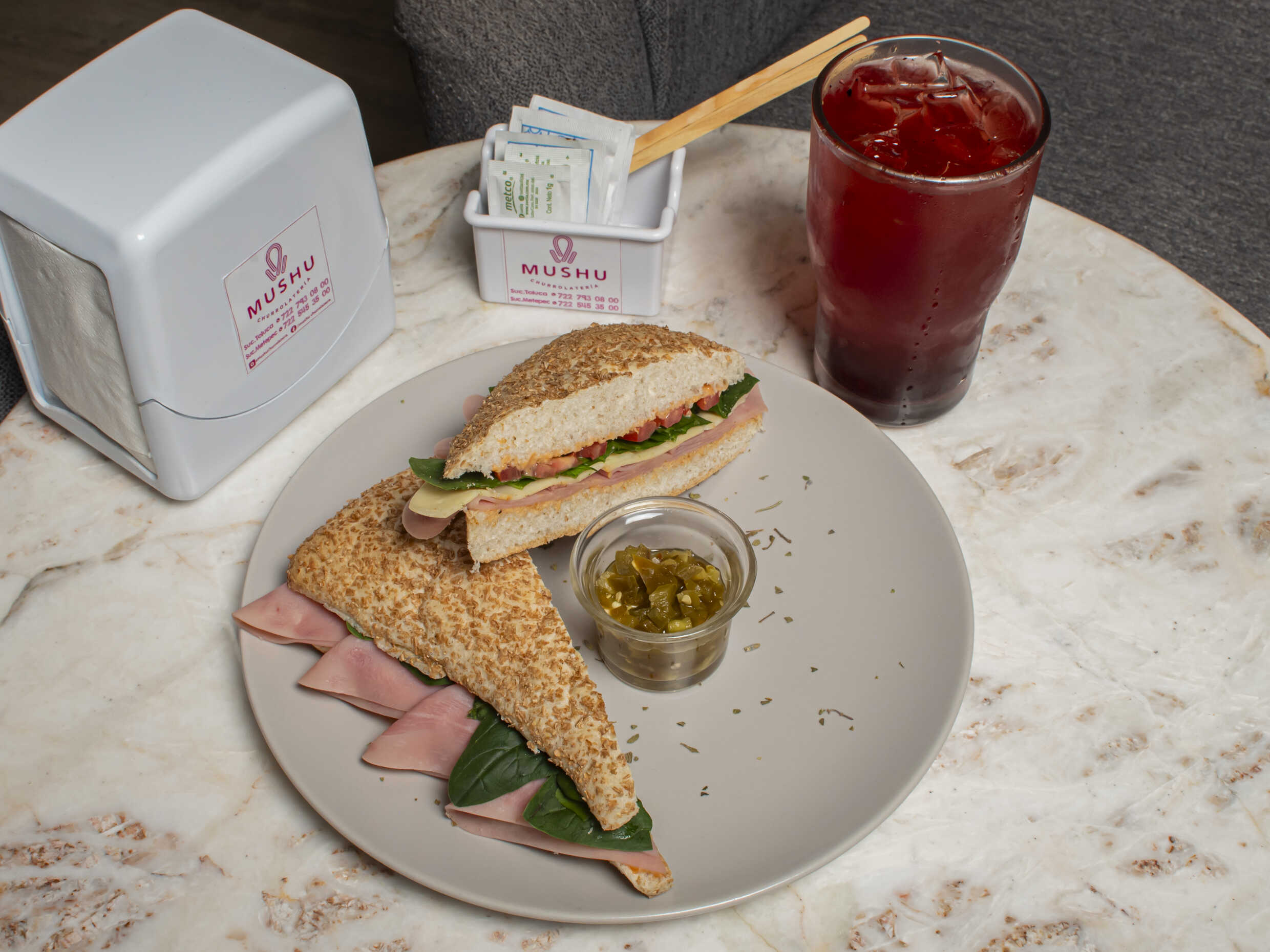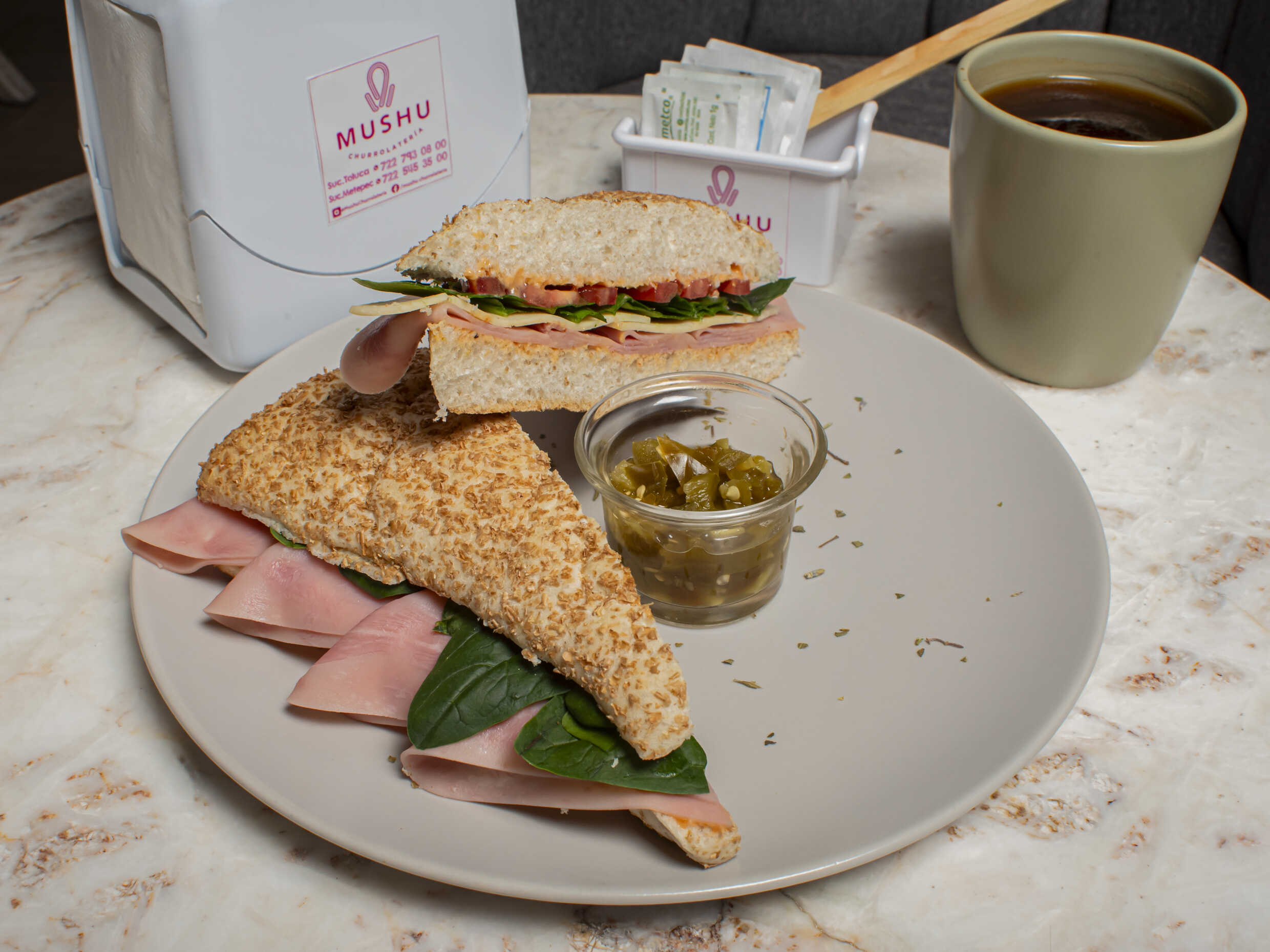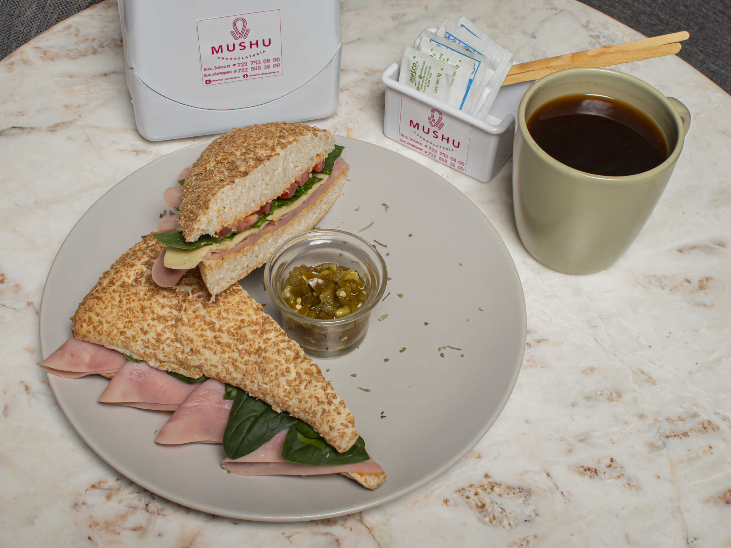 Jamón de pavo, queso manchego, espinaca, jitomate.